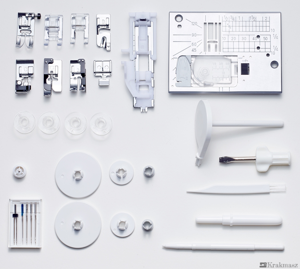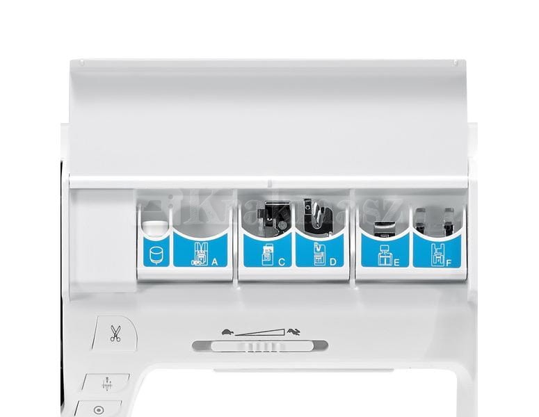od samego brzegu materiału, zachowując absolutną precyzję) - wbudowane 3 zewnętrzne obcinacz nitek (jeden przy szpulowniku, drugi w płytce ściegowej do nici spodniej oraz jeden na obudowie maszyny do nici górnej)