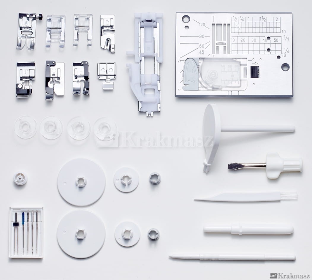 - 388 programów ściegowych (w tym ściegi proste, potrójnie wzmacniane, elastyczne, kryte, zygzak, ścieg superowerlokowy i owerlokowy, a także ściegi ozdobne, satynowe, dziurki i alfabet)
