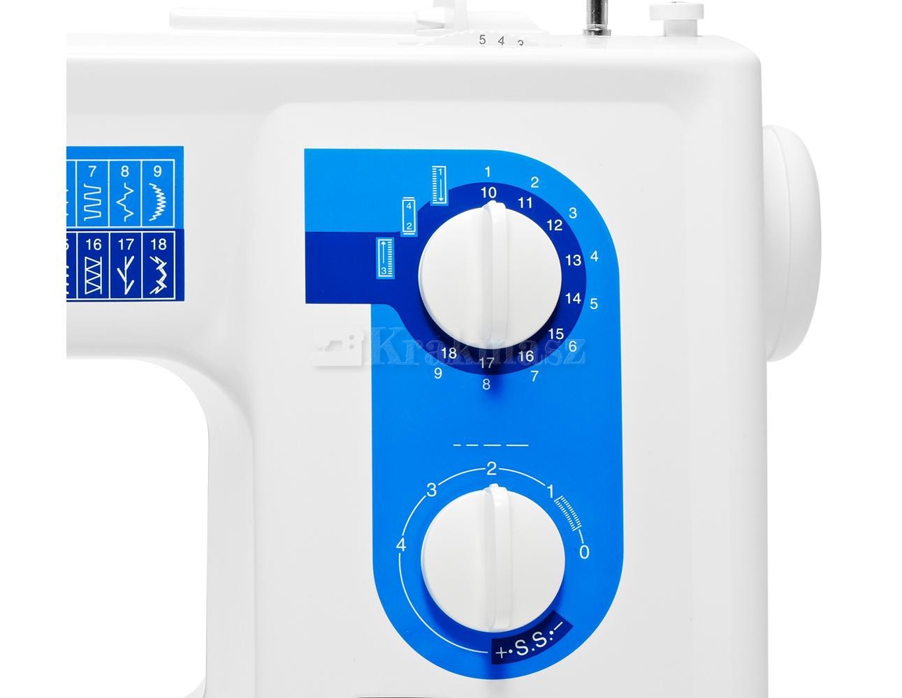 Do dyspozycji posiadamy 19 najważniejszych programów ściegowych, wśród których znajdują się ściegi proste (stebnowe), zygzaki, ścieg kryty, owerlokowy, ściegi dekoracyjne i półautomatyczne obszywanie dziurki. Dostępne programy ściegowe można płynnie regulować za pomocą dwóch wygodnych pokręteł od długości i szerokości ściegu. W tym modelu nie zabrakło również takich funkcji jak np. nawlekacz igły (nawlekanie igły już nigdy nie sprawi problemów), regulowany docisk stopki (jest bardzo pomocny podczas szycia różnych materiałów) czy chwytacz rotacyjny, dzięki któremu wymiana dolnej szpulki jest szybsza i łatwiejsza a maszyna pracuje ciszej.
