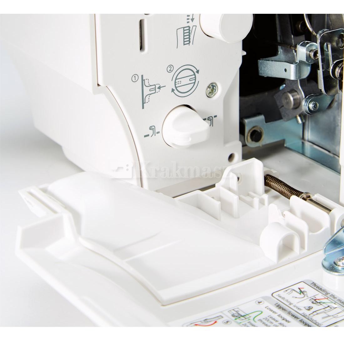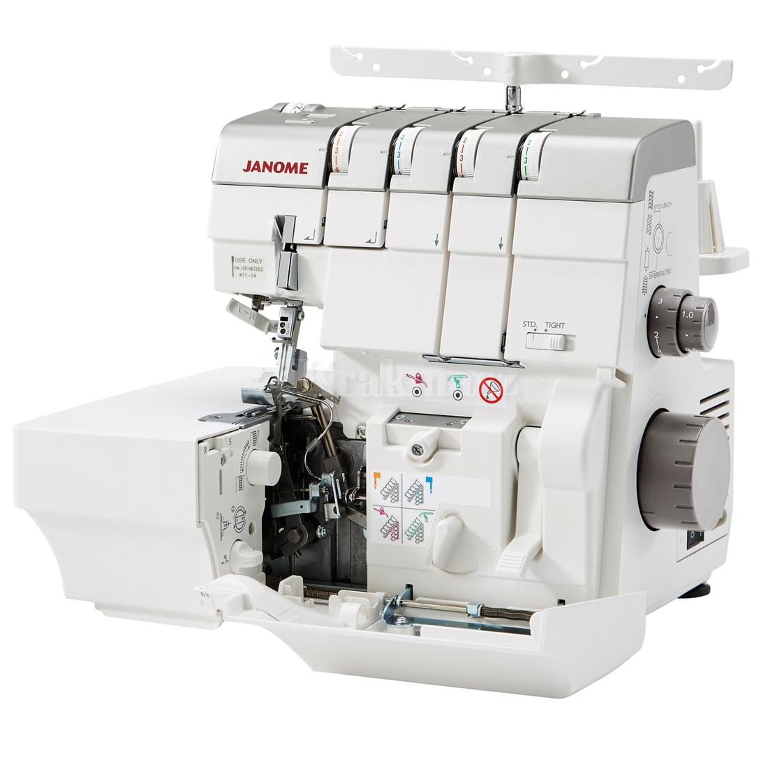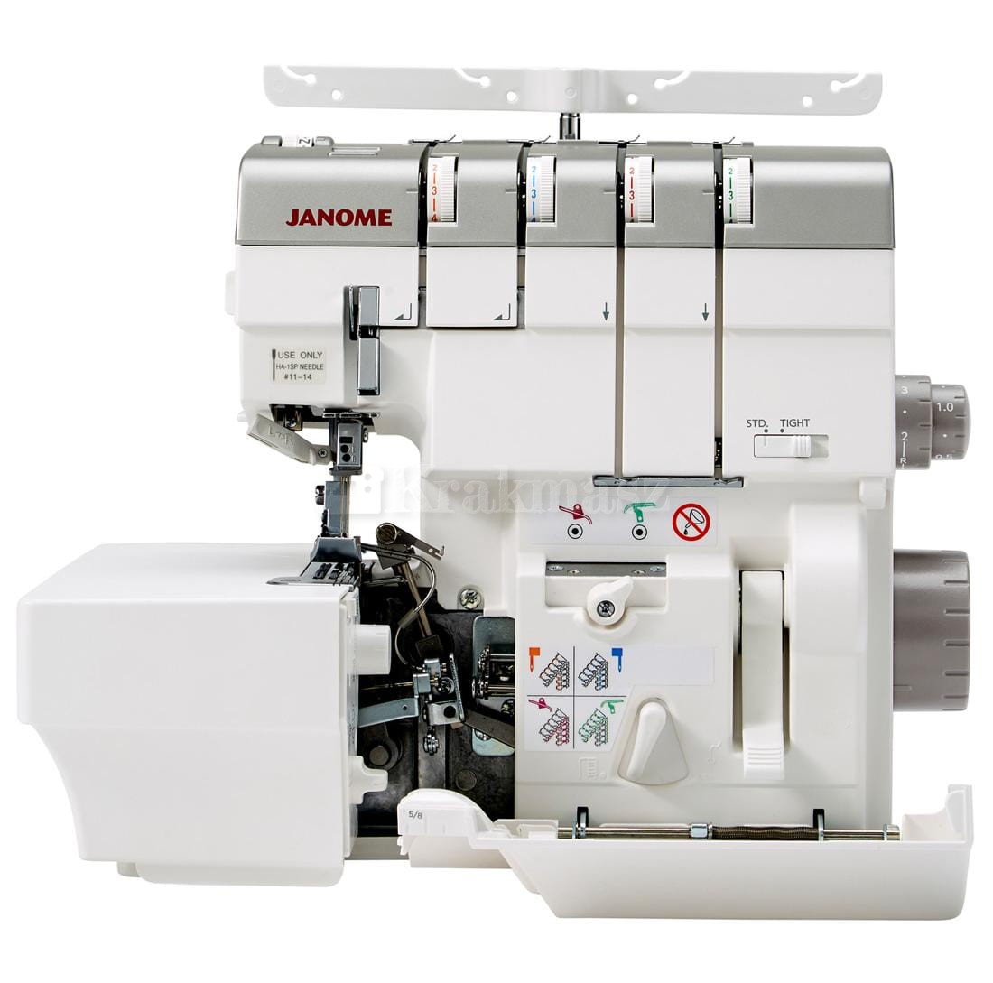 W nowoczesnym owerloku Janome aż roi się od udogodnień. Wszystkie pokrętła i dźwignie, służące do ustawienia parametrów, są rozmieszczone ergonomicznie, blisko siebie. Długość ściegu i wartość dyferencjału ustawia się zintegrowanymi pokrętłami z prawej strony maszyny, z kolei regulacja szerokości obcinania materiału i wyłączanie noża obcinającego oraz przełącznik standardowego ściegu na mereżkę znajdują się tuż pod otwieraną przednią pokrywą. Bez otwierania pokrywy mamy ponadto dostęp do suwaka, którym ustawia się naprężenie nici dolnego chwytacza.