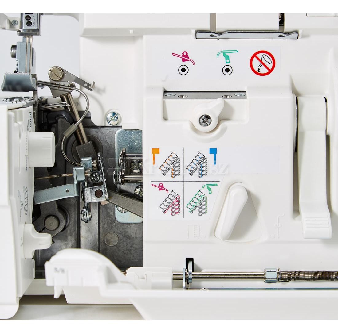 "Air Thread" w nazwie maszyny oznacza innowacyjny, pneumatyczny system nawlekania chwytaczy. Wystarczy wsunąć nitkę w otwór nawlekacza i przesunąć dźwignię, a pęd powietrza przeprowadzi nić, nawlekając chwytacz. To niezwykle proste, nawleczenie dolnego i górnego chwytacza zajmuje zaledwie parę chwil. Dodatkowo owerlok wyposażono w automatyczny nawlekacz igieł, sprawiając, że przygotowanie maszyny do pracy zostało maksymalnie uproszczone. To świetna wiadomość dla wszystkich, którzy obawiają się skomplikowanego nawlekania owerloków.