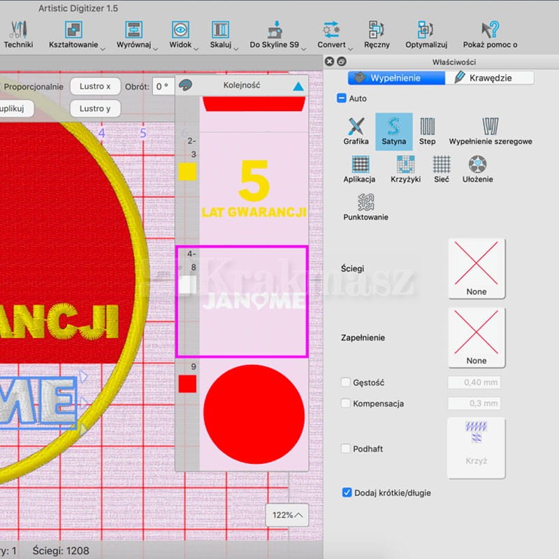 W programie jest do dyspozycji 262 wbudowane czcionki (w tym czcionki True Type i Open Type), a także czcionki zawierające polskie litery i znaki specjalne. Projektowanie własnych wzorów hafciarskich w programie Janome Artistic Digitizer jest możliwe w dwóch trybach: manualnym (krok po kroku sam definiujesz poszczególne elementy haftu, masz kontrolę nad każdym nawet pojedynczym wkłuciem igły) lub automatycznym (program sam zamienia zdjęcia/ rysunek/ grafikę na gotowy haft). Projektując haft, do dyspozycji masz 195 gotowych ściegów wypełniających z możliwością ich pełnej regulacji i edycji. Dodatkowo każdy haft możesz: obracać, duplikować, grupować, zmieniać jego wielkość czy nawet zarządzać kolejnością haftowanych obiektów. Po zaprojektowaniu wzoru korzystając z funkcji wizualizacji, możesz swobodnie podejrzeć powstały efekt.
