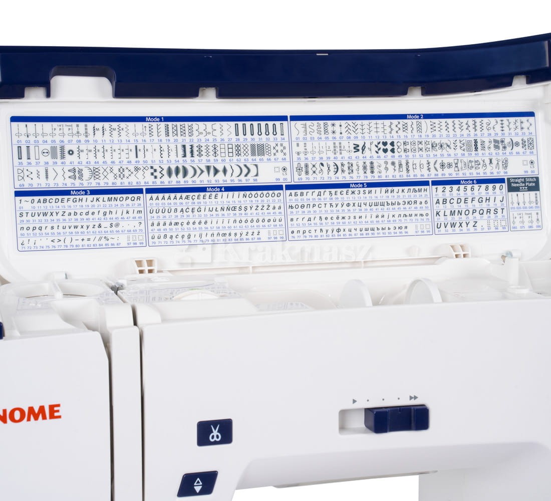 - 512 dostępnych programów ściegowych, w tym ściegi proste (stebnowe), kryte, elastyczne, zygzak, satynowe, owerlokowe, ozdobne, potrójnie wzmacniane, dziurki i alfabet