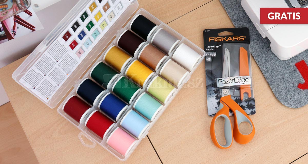 Teraz kupując maszynę do szycia Janome Skyline S7 otrzymasz duży zestaw nici - Madeira 8063 (18 szpulek) i niezwykle wygodne nożyczki krawieckie Fiskars RazorEdge (21 cm).