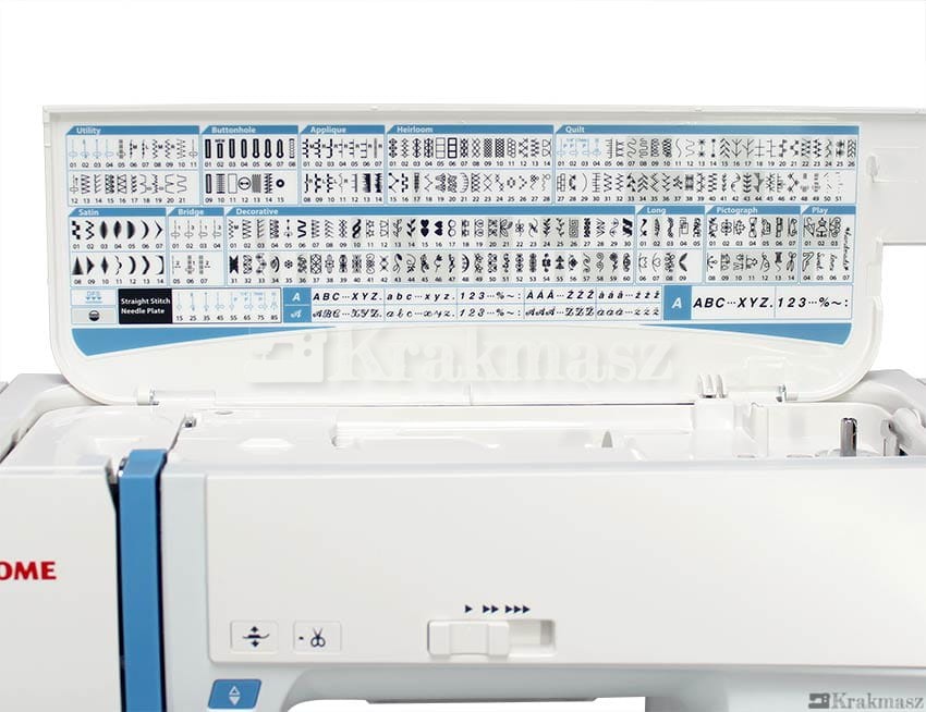 - 580 dostępnych programów ściegowych, w tym ściegi proste, kryte, stretch, zygzak, satynowe, owerlokowe, ozdobne, drabinkowe, mostkowe, drzewkowe, potrójnie wzmacniane, dziurki i alfabet