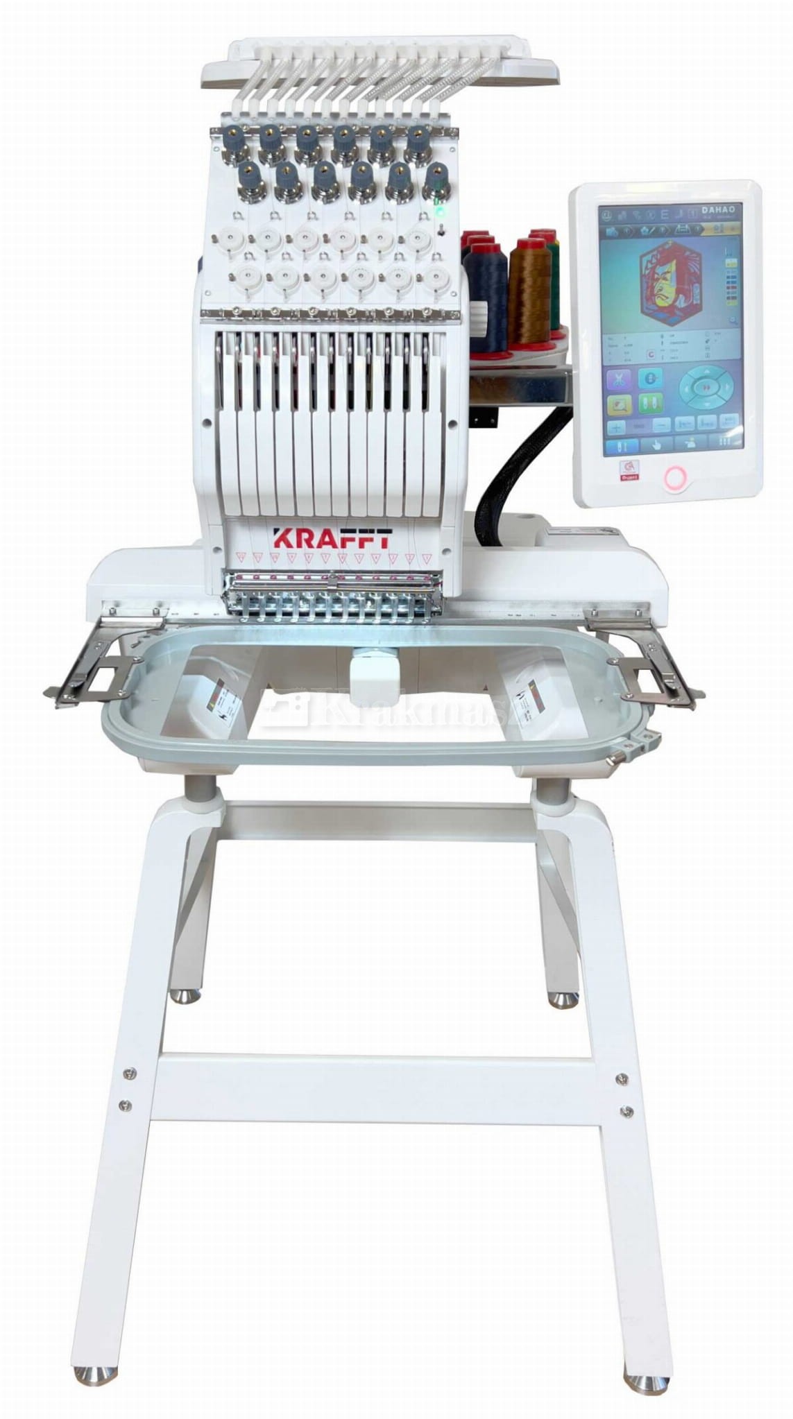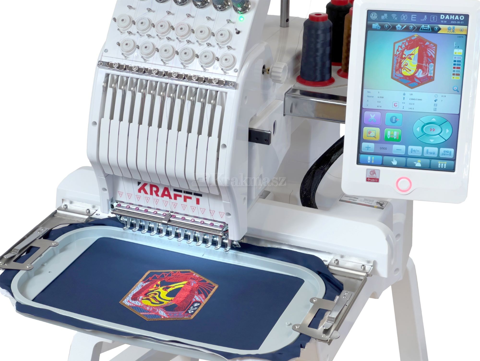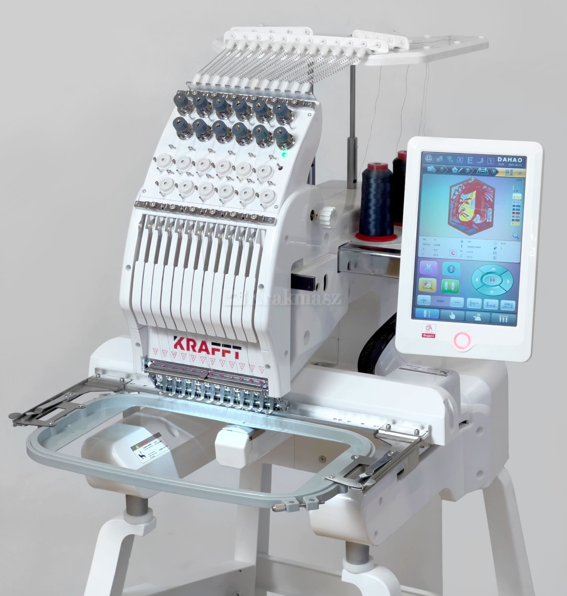 Hafciarka KRAFFT wyposażona jest w duży 10” kolorowy dotykowy panel sterujący z menu w języku polskim. Automatyczny start i zmiana koloru. Bardzo wysoka jakość wykonania oraz szerokie możliwości wyszywania sprawiają, że znajduje zastosowanie w bardzo wielu produktach.