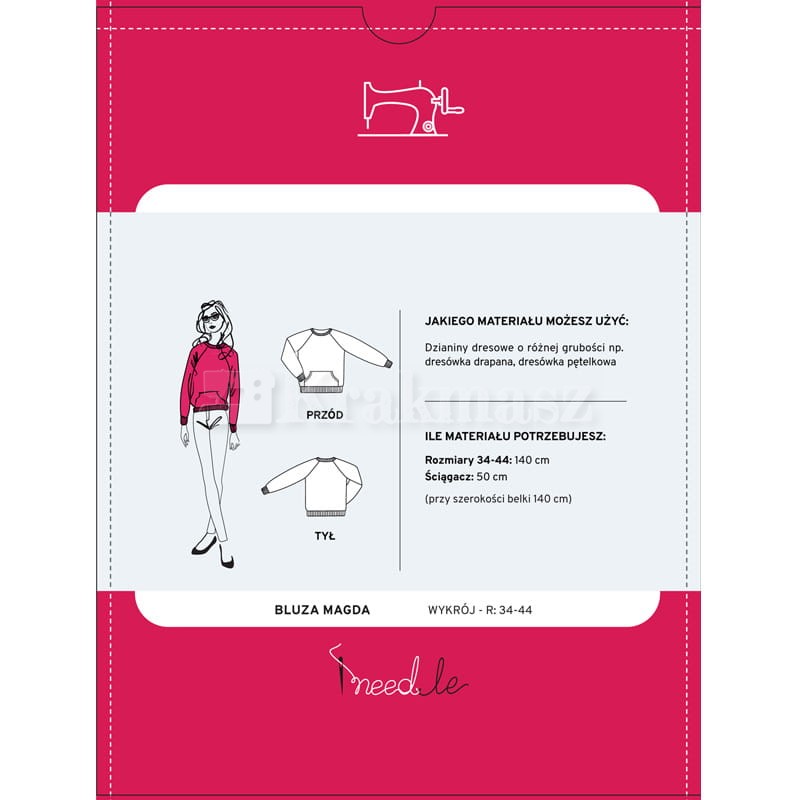 Na podstawie tego wykroju uszyjesz bluzę z rękawem raglanowym w rozmiarze od 34 do 44. Bluza Magda ma luźny krój, długie raglanowe rękawy, które tak samo jak dekolt, dół bluzy i rękaw są wykończone ściągaczem. Wykrój na bluzę damską z raglanowym rękawem jest umieszczony na dużym arkuszu papieru z wyraźnie narysowanymi rozmiarami. Każdy rozmiar jest oznaczony osobnym kolorem więc znalezienie i odrysowanie tego, na którym nam zależy jest bardzo łatwe. Poza wykrojem na tym samym arkuszu papiery znajdziesz bardzo przydatne podpowiedzi jak np. jak zdjąć miarkę z sylwetki i prawidłowo wybrać rozmiar odzież, który planujemy uszyć. Znajdziesz tam także informację jak odrysować wykrój, w jakiej kolejności wyciąć materiał czy jak uszyć wybrany model odzieży.
