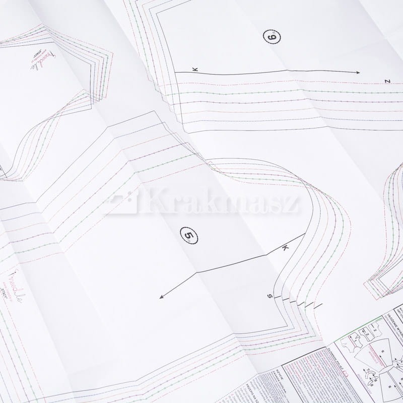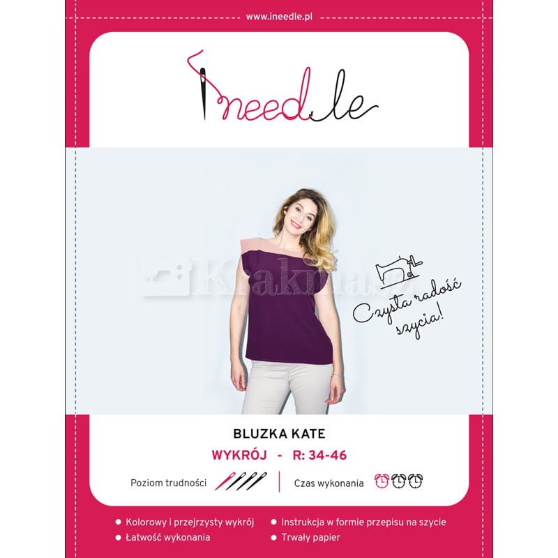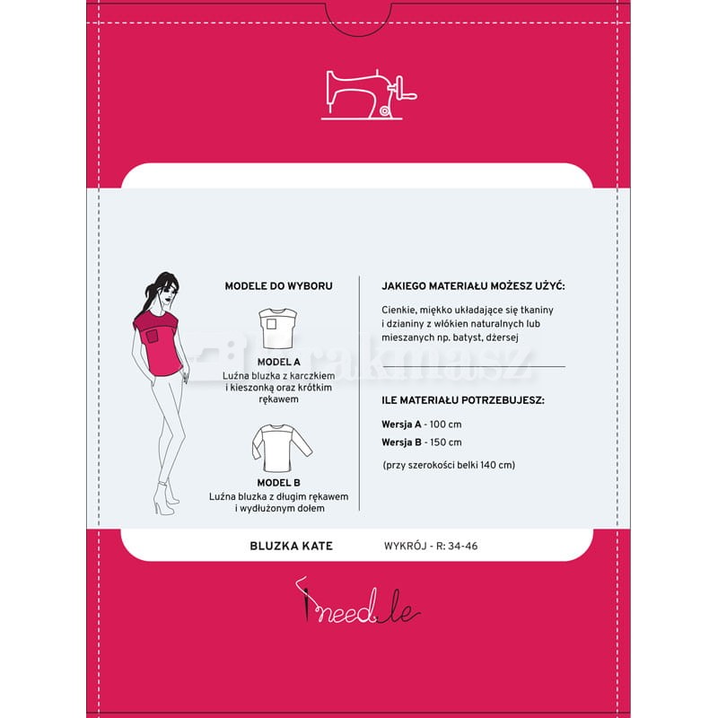Na podstawie tego wykroju uszyjesz bluzkę damską typu kimono w rozmiarze od 34 do 46. Dodatkowo wykrój umożliwia uszycie kilku wersji bluzek: jedno lub dwukolorowych, z krótkim rękawem i kieszonką czy z długim rękawem, kieszonką i wydłużonym dołem. Bluzka Kate ma luźny krój i sięga w okolicach bioder. Wykrój na bluzkę damską typu kimono jest umieszczony na dużym arkuszu papieru z wyraźnie narysowanymi rozmiarami. Każdy rozmiar jest oznaczony osobnym kolorem więc znalezienie i odrysowanie tego, na którym nam zależy, jest bardzo łatwe. Poza wykrojem na tym samym arkuszu papiery znajdziesz bardzo przydatne podpowiedzi jak np. jak zdjąć miarkę z sylwetki i prawidłowo wybrać rozmiar odzież, który planujemy uszyć. Znajdziesz tam także informację jak odrysować wykrój, w jakiej kolejności wyciąć materiał czy jak uszyć wybrany model odzieży.