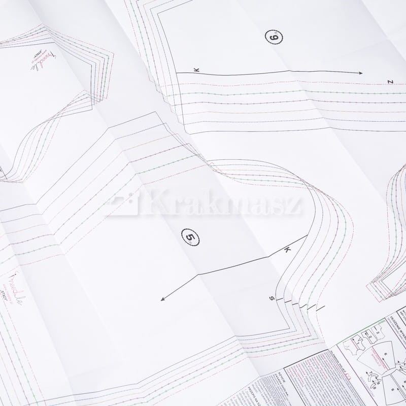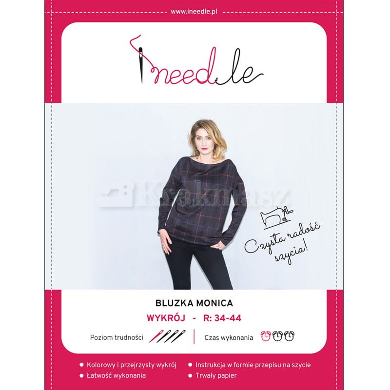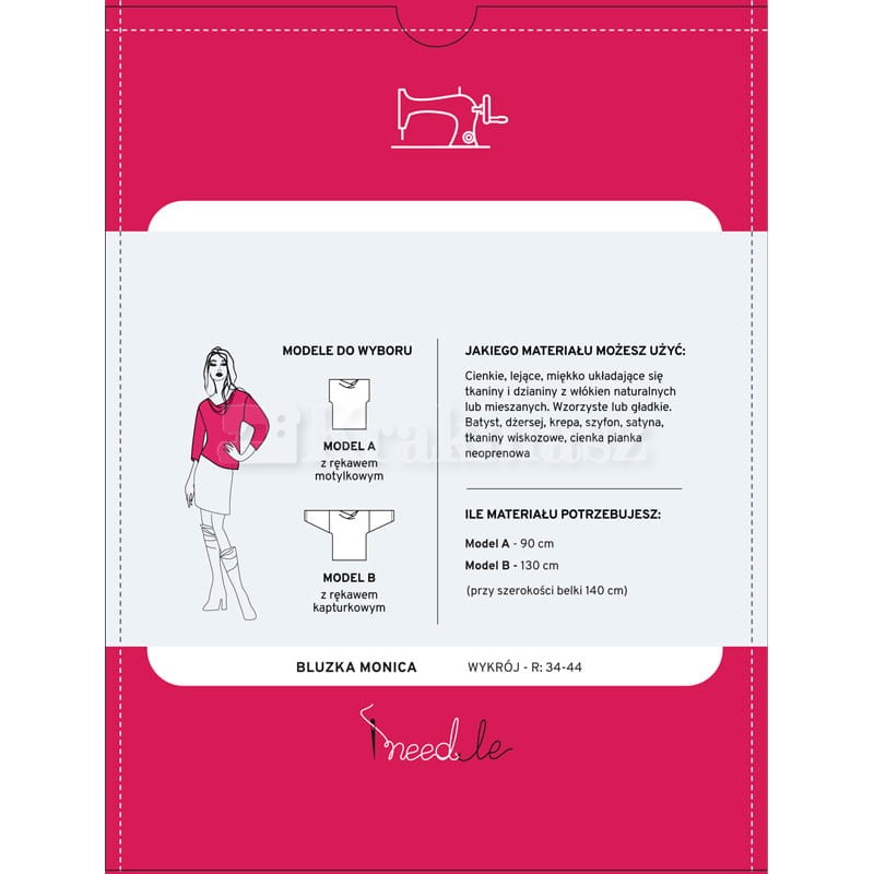 Na podstawie tego wykroju uszyjesz bluzę damską typu kimono w rozmiarze od 34 do 44. Dodatkowo wykrój umożliwia uszycia dwóch wersji bluzki: z długimi i obniżonymi rękawami lub krótkimi i opadającymi. Bluzka Monika ma luźny krój, długość do połowy bioder i dekolt w kształcie „małej wody”. Wykrój na bluzkę damską typu kimono jest umieszczony na dużym arkuszu papieru z wyraźnie narysowanymi rozmiarami. Każdy rozmiar jest oznaczony osobnym kolorem więc znalezienie i odrysowanie tego, na którym nam zależy, jest bardzo łatwe. Poza wykrojem na tym samym arkuszu papiery znajdziesz bardzo przydatne podpowiedzi jak np. jak zdjąć miarkę z sylwetki i prawidłowo wybrać rozmiar odzież, który planujemy uszyć. Znajdziesz tam także informację jak odrysować wykrój, w jakiej kolejności wyciąć materiał czy jak uszyć wybrany model odzieży.