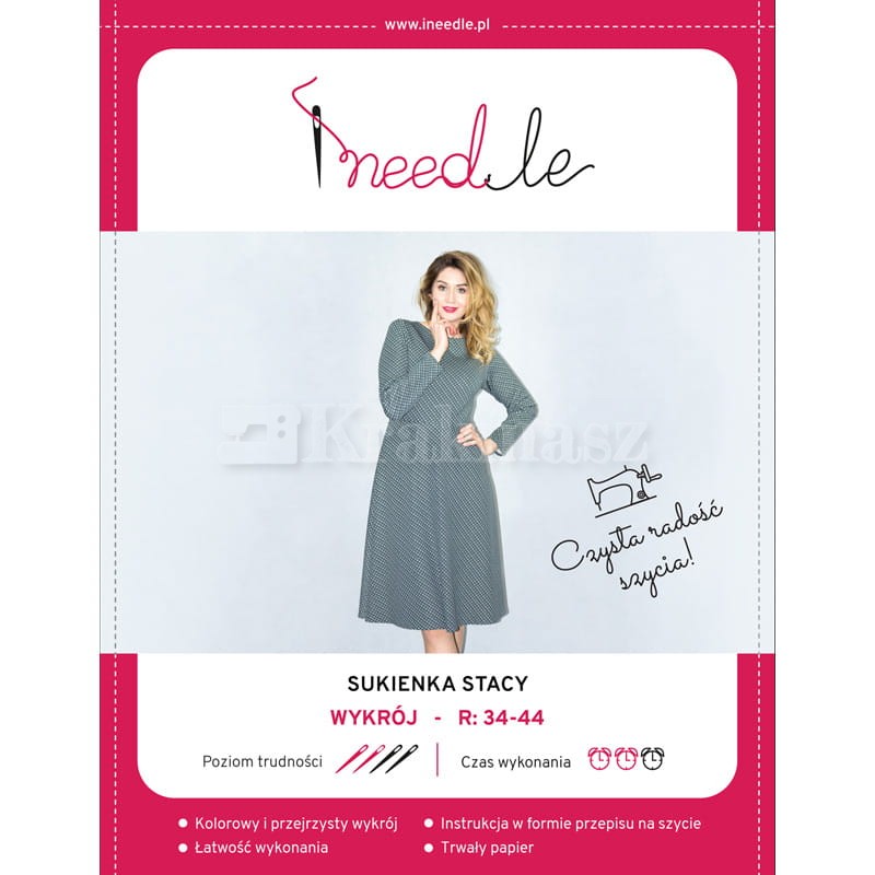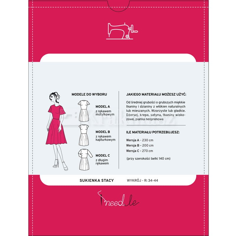 Na podstawie tego wykroju uszyjesz klasyczną, sukienkę damską w rozmiarze od 34 do 44. Sukienka Stacy jest klasyczną sukienką damską z lekkim odcięciem i dopasowaniem w talii. Długość sięga w okolice kolan, a całość jest zapinana na zamek. Wykrój umożliwia uszycia sukienki z trzeba wersjami rękawków, czyli z motylkowym, kapturkowym i długim. Wykrój na klasyczną sukienkę damską jest umieszczony na dużym arkuszu papieru z wyraźnie narysowanymi rozmiarami. Każdy rozmiar jest oznaczony osobnym kolorem więc znalezienie i odrysowanie tego, na którym nam zależy, jest bardzo łatwe. Poza wykrojem na tym samym arkuszu papiery znajdziesz bardzo przydatne podpowiedzi jak np. jak zdjąć miarkę z sylwetki i prawidłowo wybrać rozmiar odzież, który planujemy uszyć. Znajdziesz tam także informację jak odrysować wykrój, w jakiej kolejności wyciąć materiał czy jak uszyć wybrany model odzieży.