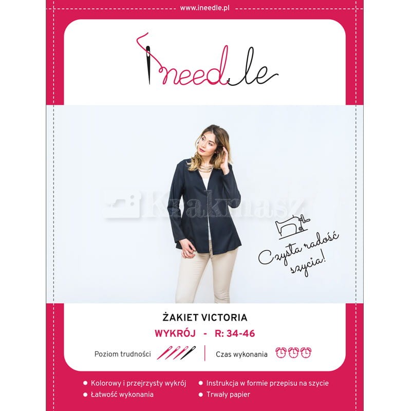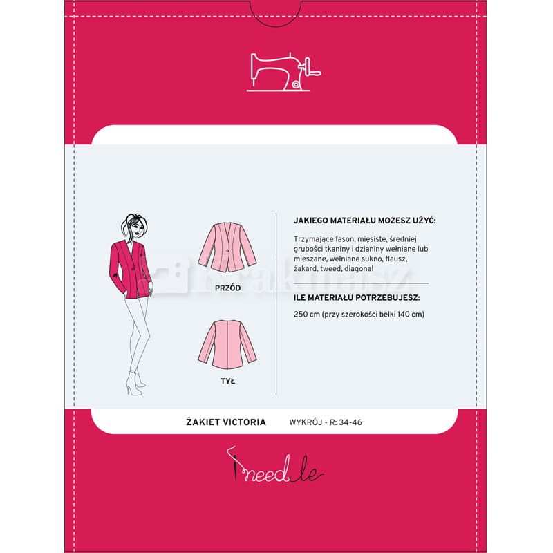 Na podstawie tego wykroju uszyjesz lekko dopasowaną marynarkę damską w rozmiarze od 34 do 46. Marynarka Victoria ma prosty krój z bocznymi cięciami delikatnie podkreślającymi sylwetkę. Długość sięgającą w okolice bioder i długi rękaw. Jest zapinana na małą haftkę. Wykrój na marynarkę damską jest umieszczony na dużym arkuszu papieru z wyraźnie narysowanymi rozmiarami. Każdy rozmiar jest oznaczony osobnym kolorem więc znalezienie i odrysowanie tego, na którym nam zależy, jest bardzo łatwe. Poza wykrojem na tym samym arkuszu papiery znajdziesz bardzo przydatne podpowiedzi jak np. jak zdjąć miarkę z sylwetki i prawidłowo wybrać rozmiar odzież, który planujemy uszyć. Znajdziesz tam także informację jak odrysować wykrój, w jakiej kolejności wyciąć materiał czy jak uszyć wybrany model odzieży.