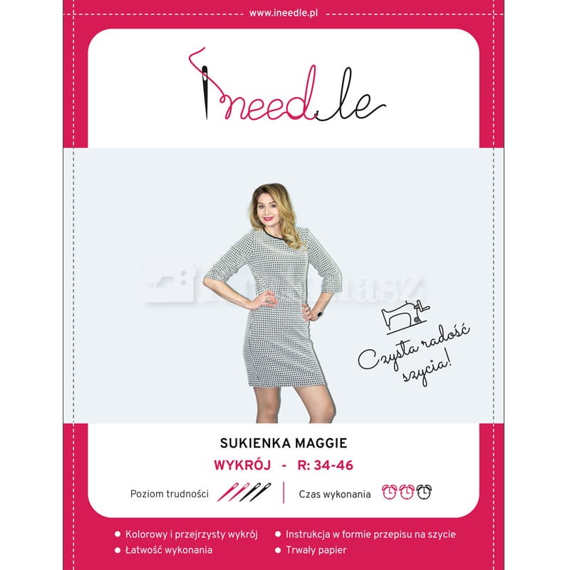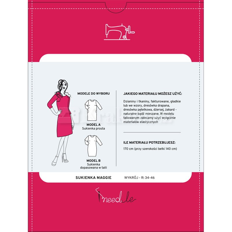 Na podstawie tego wykroju uszyjesz prostą sukienkę damską w rozmiarze od 34 do 46. Wykrój umożliwia uszycia dwóch rodzajów sukienke; luźniej o prostej formie i kieszeniami po dokach lub klasyczne i dopasowanej w talii Sukienka Maggie ma długie rękaw, klasyczny dekolt, jest zapinana na zamek, a jaj długość sięga w okolice ud. Wykrój na sukienkę damską jest umieszczony na dużym arkuszu papieru z wyraźnie narysowanymi rozmiarami. Każdy rozmiar jest oznaczony osobnym kolorem więc znalezienie i odrysowanie tego, na którym nam zależy, jest bardzo łatwe. Poza wykrojem na tym samym arkuszu papiery znajdziesz bardzo przydatne podpowiedzi jak np. jak zdjąć miarkę z sylwetki i prawidłowo wybrać rozmiar odzież, który planujemy uszyć. Znajdziesz tam także informację jak odrysować wykrój, w jakiej kolejności wyciąć materiał czy jak uszyć wybrany model odzieży.